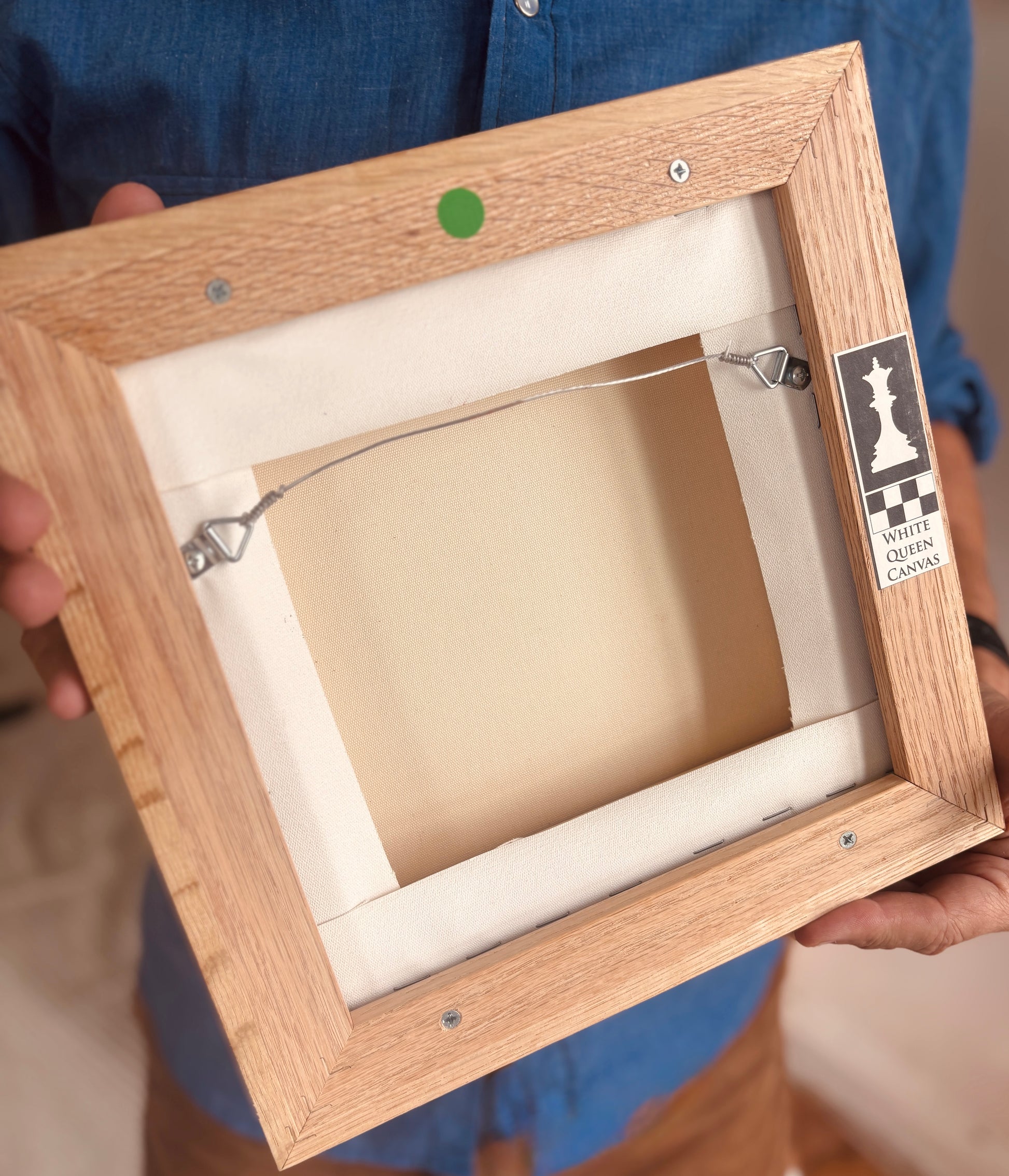 With the sturdy oak frame, these paintings can be hung on a wall or be freestanding on a bench or table etc. All of these come with wire hanging set-up on the back.